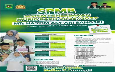 Telah dibuka Sistem Penerimaan Murid Baru (SPMB) MTs. Hasyim Asy'ari Bangsri Jepara TP. 2026/2027 resmi di buka, silahkan bapak/ibu yang mempunyai putra putri kelas 6 SD/MI untuk segera daftarkan di MTs. Hasyim Asy'ari Bangsri, sekarang dibuka kelas Baru