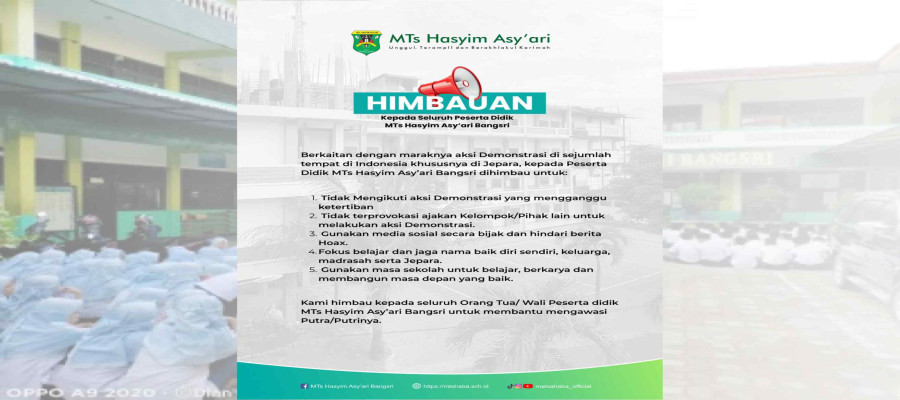 Kepada Yth. Siswa-siswi Kelas IX MTs Hasyim Asy'ari Bangsri Dengan hormat, Kami sampaikan bahwa pengumuman kelulusan akan disampaikan secara online pada: Hari/Tan