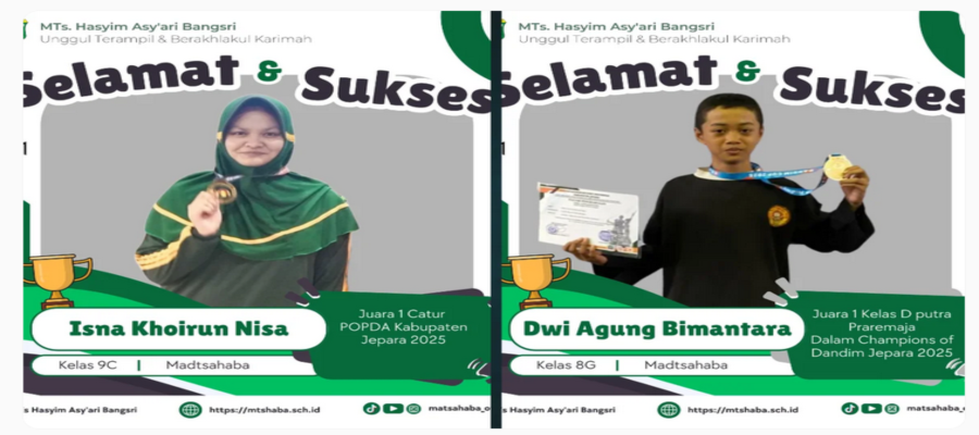 Selamat kami sampaikan kepada peserta didik kami atas nama ISNA KHOIRUN NISA binti Suhartomo dan ibu Endang Sri Harnanik Juara 1 Lomba Cabang Catur POPDA Kabupaten Jepara dan Pencak Silat Juara 1 ananda DWI GALUH BIMANTARA bin S.Hartanto dan Kusniya, atas