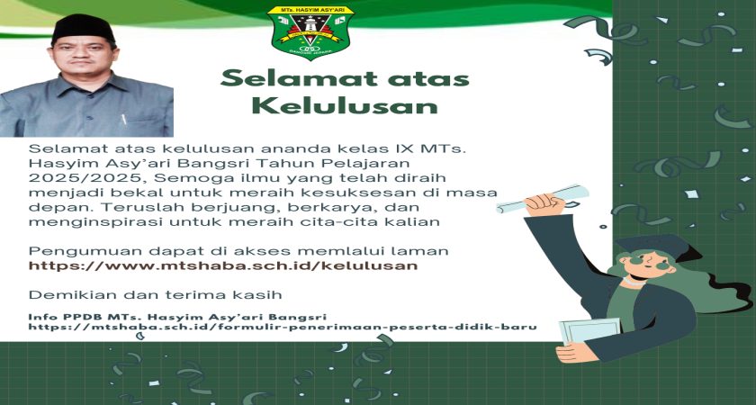 Tetap jalin silaturahmi dan komunikasi dengan madrasah melalui WA grup kelas untuk urusan pendistribusian Surat Keterangan Lulus (SKL). Fokuskan perhatianmu untuk persiapan masuk pendidikan ke jenjang yang lebih tinggi. Selamat berkompetisi dalam Penerimaan Peserta Didik Baru (PPDB) , baik untuk masuk ke tingkat Madrasah Aliyah (MA), Sekolah Menangah Atas (SMA) maupun Sekolah Menengah Kejuruan (SMK).